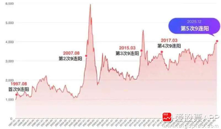 大家应该发现它们的规律了,就是每次9连阳都是在牛市期间。第一次是1997~2001的牛市,第二次是2005~2007的牛市,第三次是2015年的牛市,第四次是2017底~2021初的牛市,第五次是去年924牛市起点,现在时隔一年多,就来了第6次了。